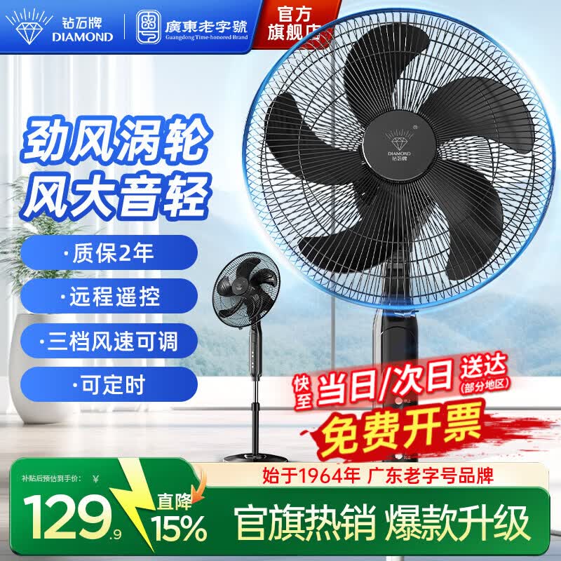 钻石牌(DIAMOND)电风扇落地扇家用风扇立式大风力客厅宿舍五叶扇轻音节能劲风远距电扇可定时SN 14寸远程遥控【9H定时】