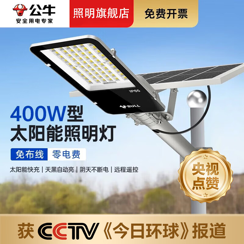 公牛(BULL)太阳能户外照明灯新款大功率庭院灯农村用天黑自动亮防水led路灯 高亮400W型+光感+遥控+照约120平