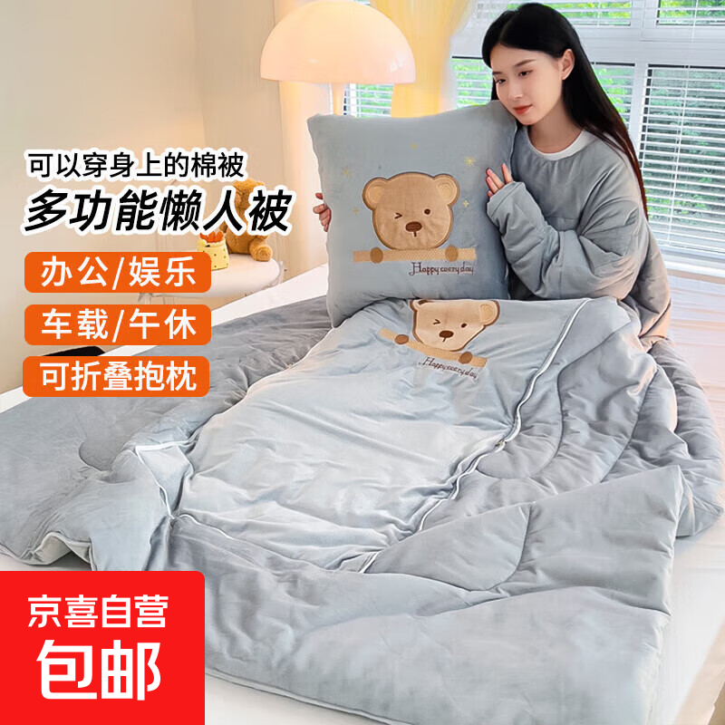 【被窝玩手机神器】牛奶绒被子秋冬季加绒加厚懒人被可穿带袖学生 憨憨熊-高级灰【双面暖绒 加厚保暖】 50*50cm展开150*200cm多功能抱枕被