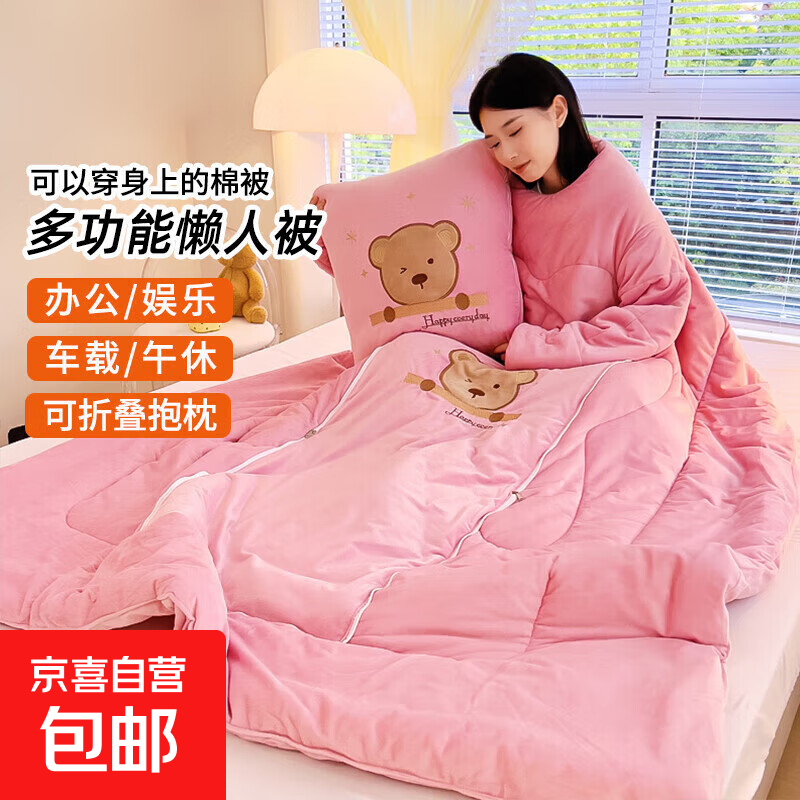 【被窝玩手机神器】牛奶绒被子秋冬季加绒加厚懒人被可穿带袖学生 憨憨熊-粉玉色【双面暖绒 加厚保暖】 50*50cm展开150*200cm多功能抱枕被