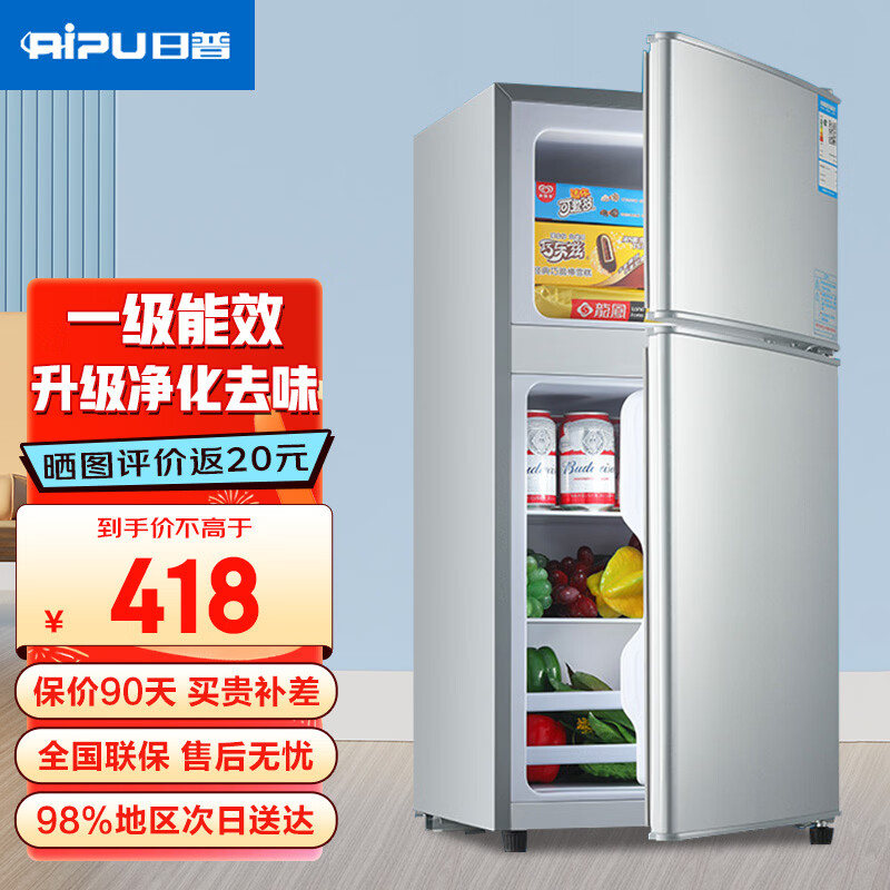 日普(RIPU)双门冰箱小型家用一级能效小冰箱迷你小型宿舍出租房办公室节能省电冷藏冷冻电冰箱 【升级净化去味】102升搁架款【冷藏3层冷冻1层】