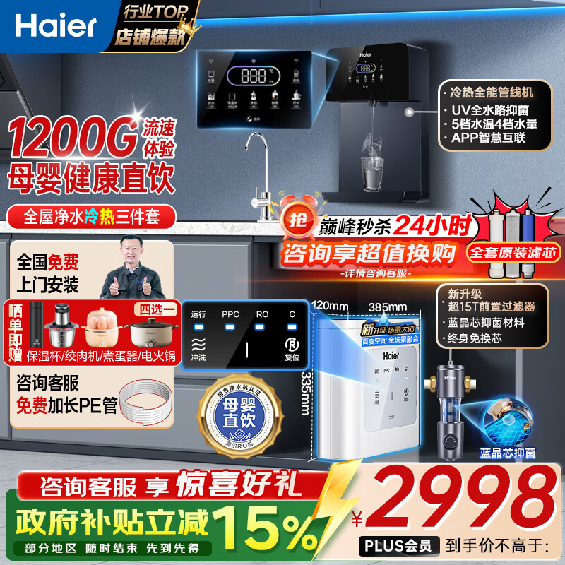 海尔(Haier)净水器家用厨下1200G流速母婴RO反渗透直饮净水机加热一体机餐边柜壁挂式管线机接自来水全屋套装 冷热管线机+净水器+爆款前置