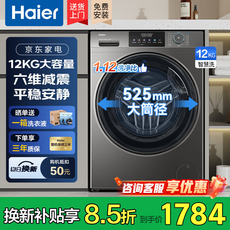 海尔滚筒洗衣机全自动10公斤带烘干洗烘一体一级能效超薄机身除菌螨以旧换新补贴 海尔50DS|品质销冠 滚筒单洗 12kg