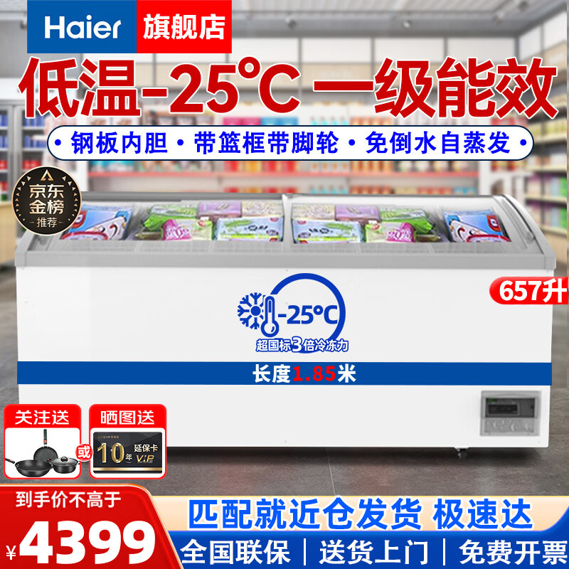 海尔(Haier)商用卧式大容量展示柜冰柜冷冻商超组合岛柜玻璃门雪糕柜弧形门海鲜冻品 1.86米零下25度657升一级能耗LED灯带锁