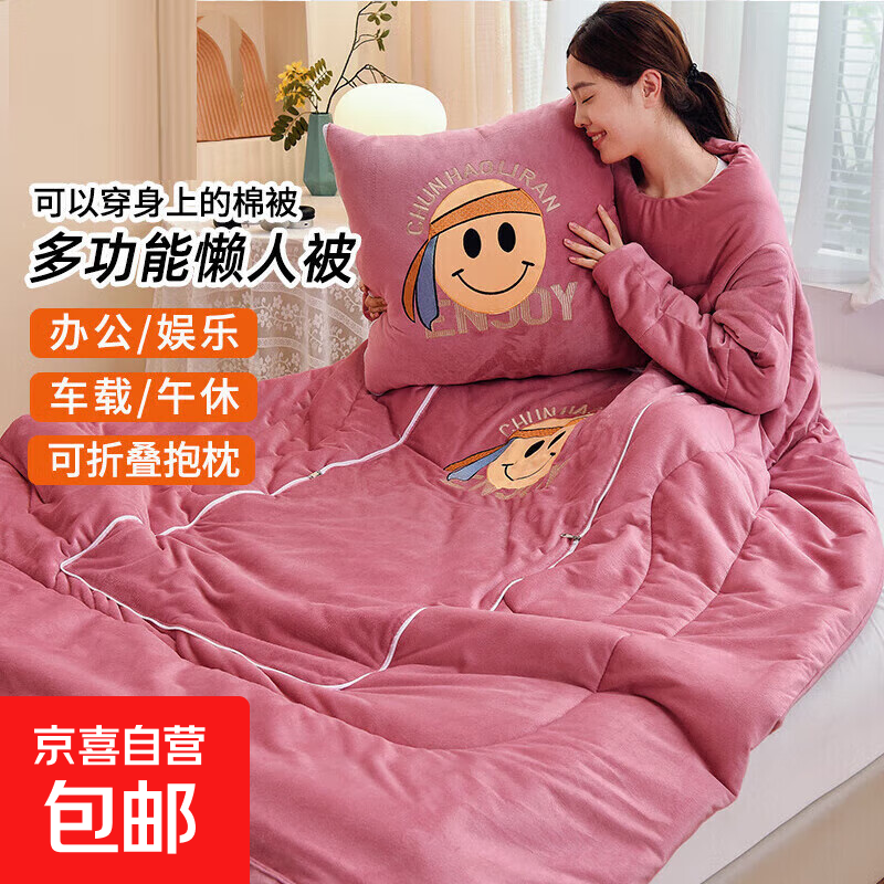 【被窝玩手机神器】牛奶绒被子秋冬季加绒加厚懒人被可穿带袖学生 笑脸-豆沙色【双面暖绒 加厚保暖】 50*50cm展开150*200cm多功能抱枕被