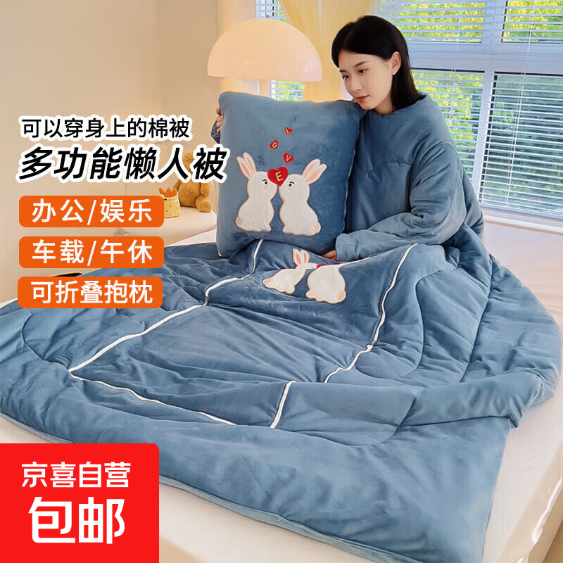 【被窝玩手机神器】牛奶绒被子秋冬季加绒加厚懒人被可穿带袖学生 亲亲兔-宝石蓝【双面暖绒 加厚保暖】 50*50cm展开150*200cm多功能抱枕被