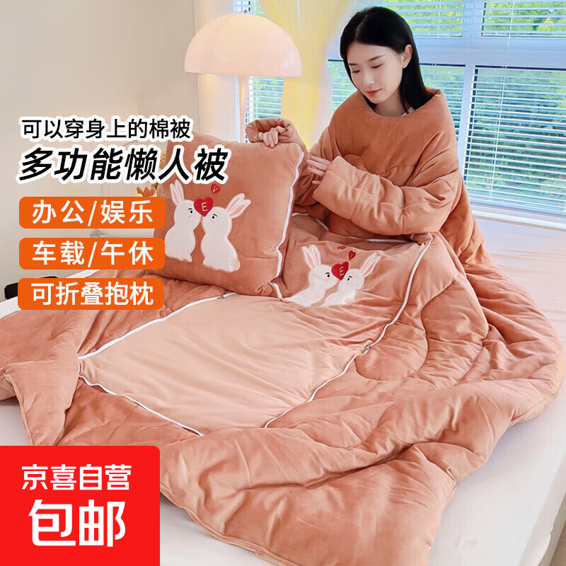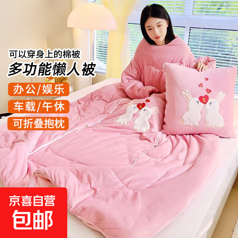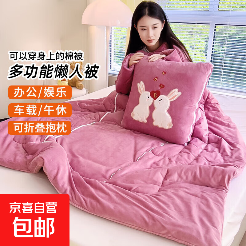 【被窝玩手机神器】牛奶绒被子秋冬季加绒加厚懒人被可穿带袖学生 亲亲兔-桃粉色【双面暖绒 加厚保暖】 50*50cm展开150*200cm多功能抱枕被