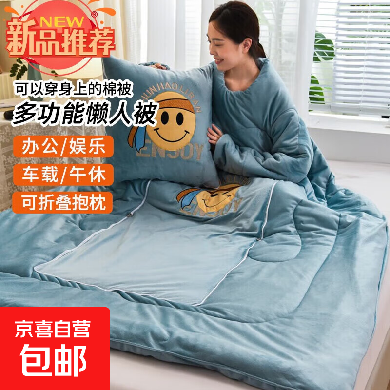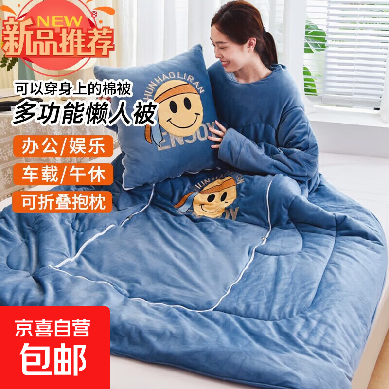 【被窝玩手机神器】牛奶绒被子秋冬季加绒加厚懒人被可穿带袖学生 笑脸-宝蓝色【双面暖绒 加厚保暖】 50*50cm展开150*200cm多功能抱枕被