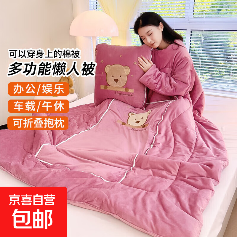 【被窝玩手机神器】牛奶绒被子秋冬季加绒加厚懒人被可穿带袖学生 憨憨熊-桃粉色【双面暖绒 加厚保暖】 50*50cm展开150*200cm多功能抱枕被