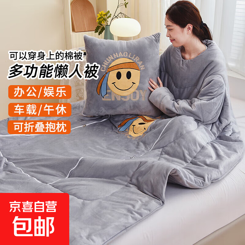 【被窝玩手机神器】牛奶绒被子秋冬季加绒加厚懒人被可穿带袖学生 笑脸-灰色【双面暖绒 加厚保暖】 50*50cm展开150*200cm多功能抱枕被