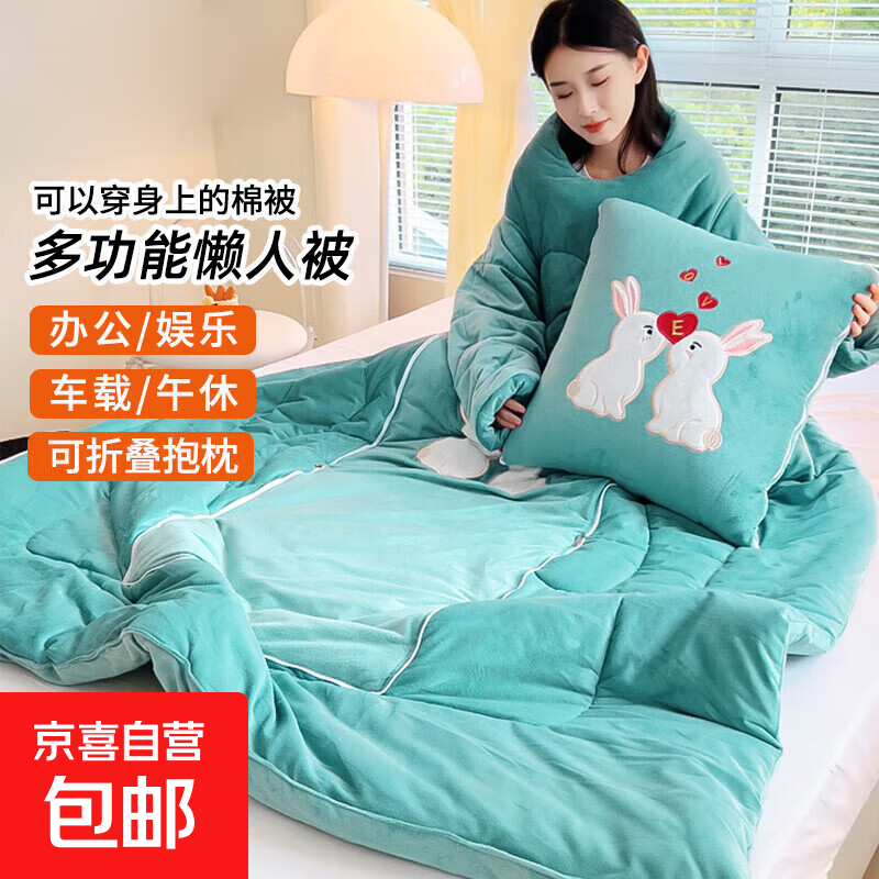 【被窝玩手机神器】牛奶绒被子秋冬季加绒加厚懒人被可穿带袖学生 亲亲兔-孔雀绿【双面暖绒 加厚保暖】 50*50cm展开150*200cm多功能抱枕被