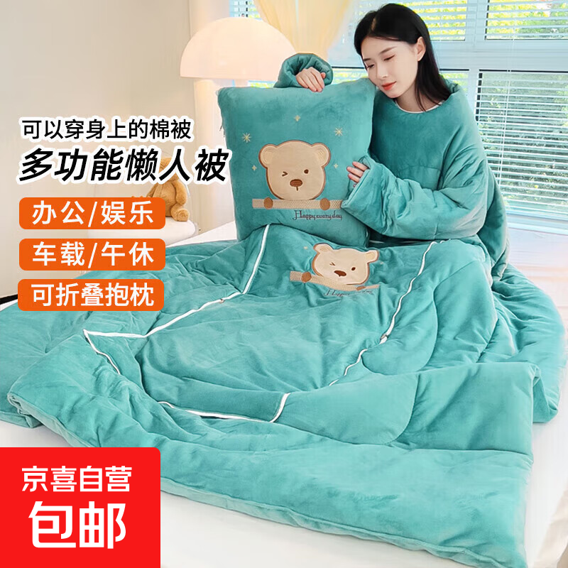 【被窝玩手机神器】牛奶绒被子秋冬季加绒加厚懒人被可穿带袖学生 憨憨熊-孔雀绿【双面暖绒 加厚保暖】 50*50cm展开150*200cm多功能抱枕被
