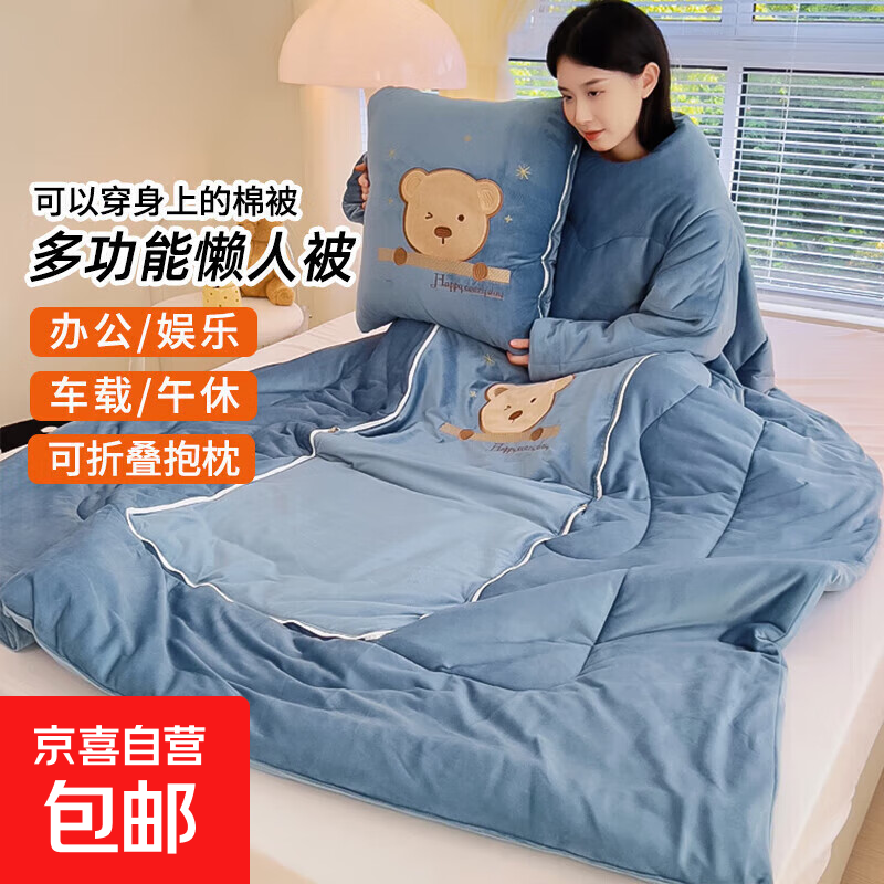 【被窝玩手机神器】牛奶绒被子秋冬季加绒加厚懒人被可穿带袖学生 憨憨熊-宝蓝色【双面暖绒 加厚保暖】 50*50cm展开150*200cm多功能抱枕被