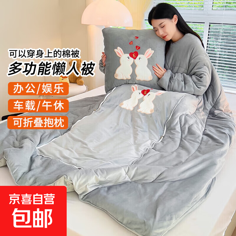 【被窝玩手机神器】牛奶绒被子秋冬季加绒加厚懒人被可穿带袖学生 亲亲兔-高级灰【双面暖绒 加厚保暖】 50*50cm展开150*200cm多功能抱枕被