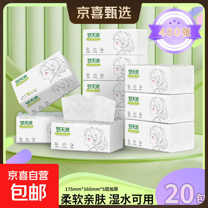 梦天浪【优等品】女孩系列480张四边压花大包家用原木抽纸面巾纸 【超值囤货】 5层 480张*20包