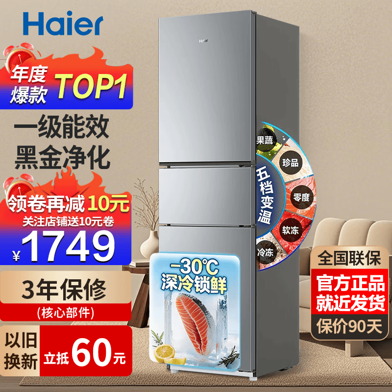 海尔冰箱家用三开门风冷无霜一级能效双开门超薄冰箱小型小冰箱制冰冷柜以旧换新冰箱补贴 226升三门一级能效新品上市