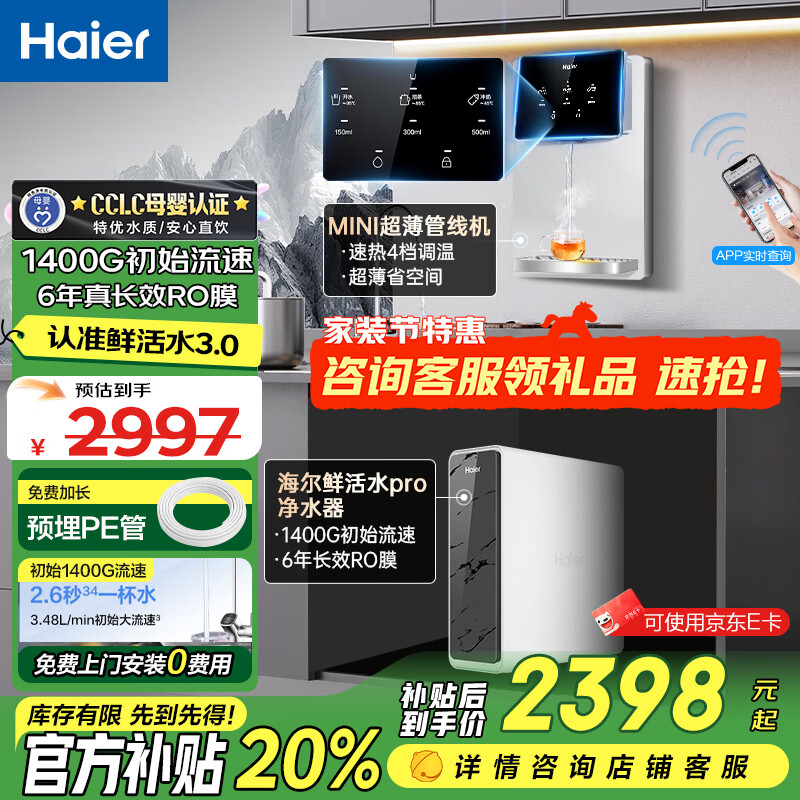 海尔(Haier)鲜活水Pro净水器管线机纯水家用瞬时1400G厨下式6年RO反渗透直饮机一体即热餐边柜R793套装1200G 净水器+TOP即热管线机