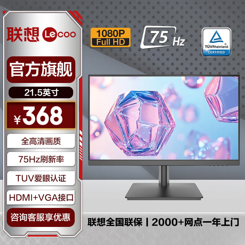 联想 21.5/23.8英寸显示器 全高清 TUV护眼认证 低蓝光不闪屏 HDMI+VGA 微边框 家用办公电脑显示屏幕 21.5英寸/75Hz刷新率