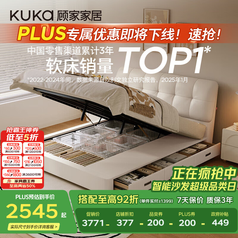 顾家家居(KUKA)奶油风猫抓皮床双人床云梦家米白巨能装储物右抽屉1.8*2米单床