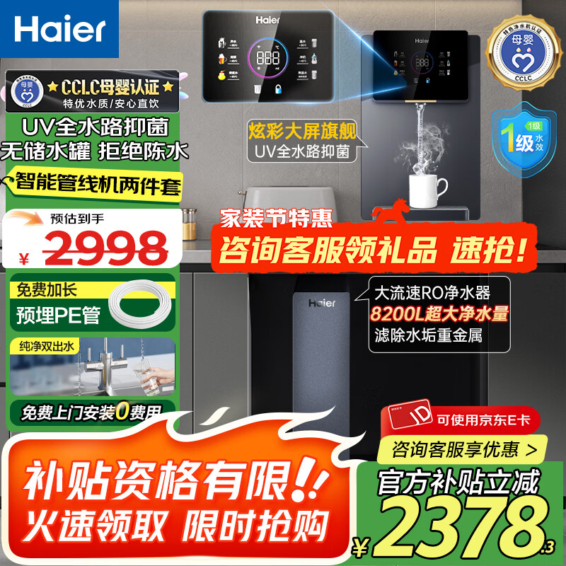 海尔净水器母婴认证家用厨下式RO反渗透纯水机管线机即热式直饮加热一体机餐边柜自来水过滤器套装 【智能两件套】净水器+UV管线机