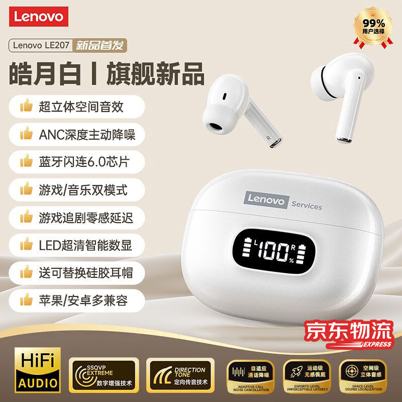 联想(Lenovo)【旗舰新款】蓝牙耳机入耳式全新蓝牙6.0真无线智能降噪超长续航高清通话音乐高音质游戏运动跑步 皓月白【升级ANC主动降噪-电量显示】 ENC通话降噪-轻奢皮革纹设计