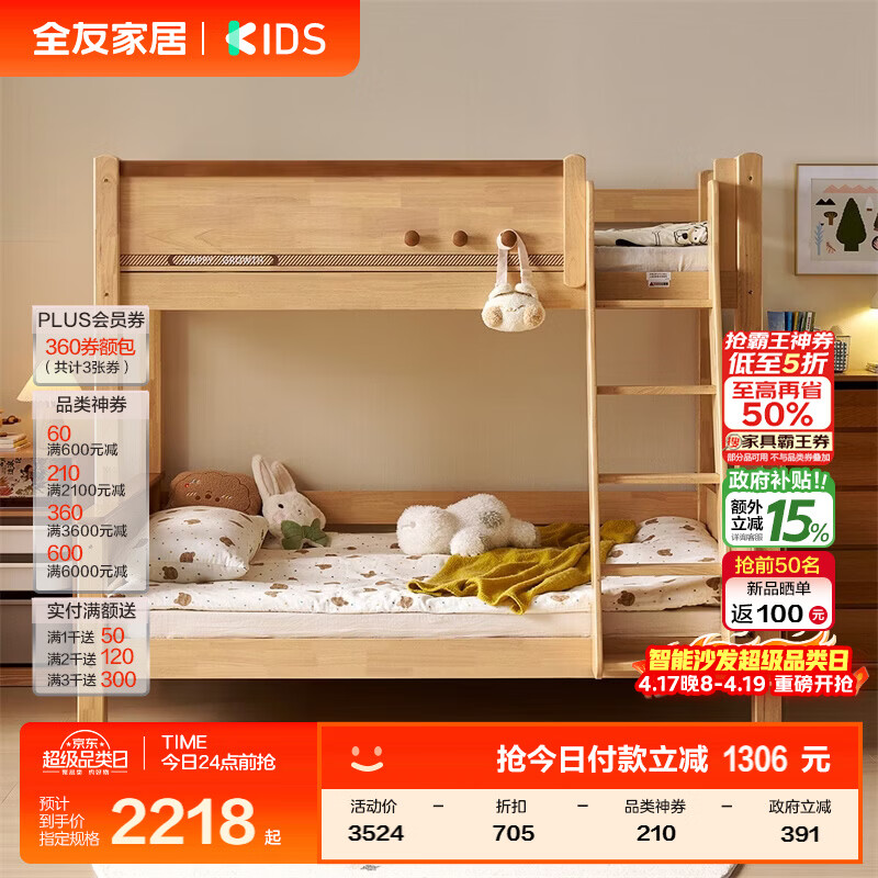 全友家居 花样系列全实木上下床男女孩双层床儿童高低床小户型 1.5m单上下床