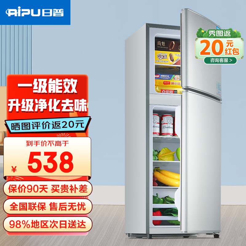 日普(RIPU)双门冰箱小型家用一级能效小冰箱迷你小型宿舍出租房办公室节能省电冷藏冷冻电冰箱 【升级净化去味】156升搁架款【冷藏4层冷冻2层】