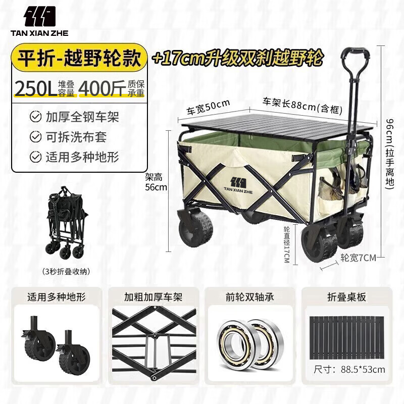 探险者(TAN XIAN ZHE)露营车儿童可躺户外推车野餐车露营装备折叠露营推车营地车买菜车 250L 春日绿【双刹越野轮+桌板】