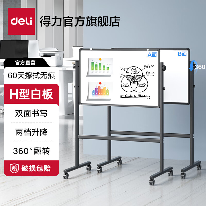 得力(deli)H型支架式白板 可上下升降可移动可磁性吸附办公会议白板 家用儿童教学画板写字板 【360°翻转】90*60cm 双面书写 2档升降