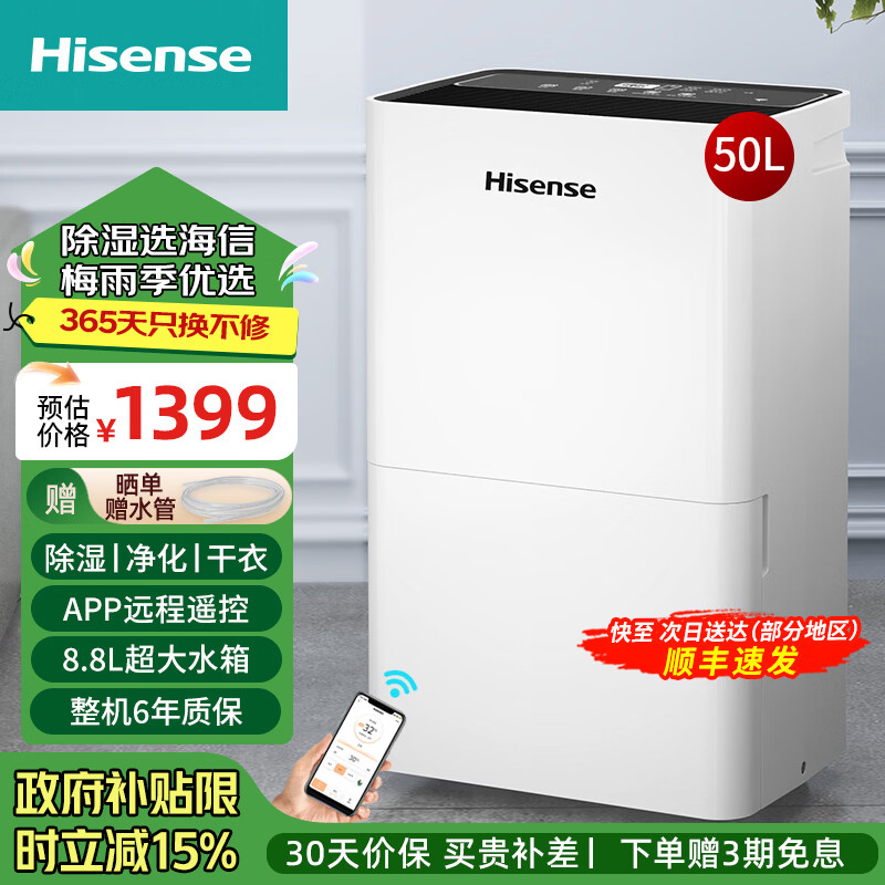 海信(Hisense)除湿机/抽湿机大面积家用除湿器轻音防霉抽湿器别墅吸湿器地下室去湿防潮干燥机 50L/天 120-180㎡ 适用整屋除湿WIFI