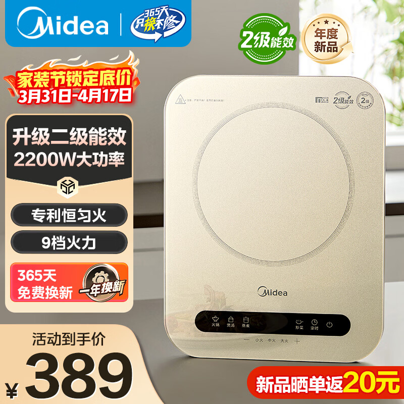 美的(Midea)电磁炉 2200W家用大功率电磁灶 9档匀火4D防水多功能烹饪 一键爆炒触控面板 线下门店同款一套带锅 升级二级能效丨恒匀火丨2200W猛火