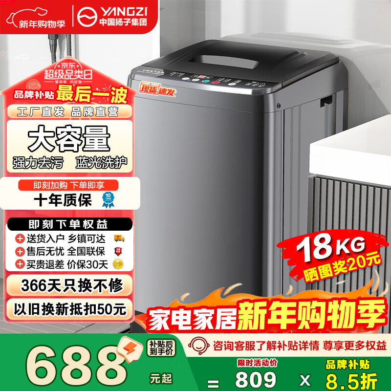 扬子(YANGZI)集团全自动波轮洗衣机 洗烘一体大容量蓝光洗护 强力风干洗衣机 小型家用出租屋宿舍 18KG【强力烘干+智能风干+防缠绕】 波轮