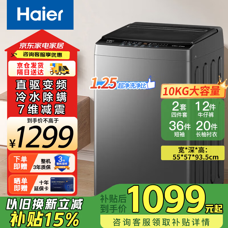 海尔(Haier)波轮洗衣机全自动一级能效直驱变频双动力大神童除菌除螨10公斤超薄家用洗衣机租房 以旧换新补贴 【升级款直驱】10公斤减震降噪+1.25洗净比 波轮