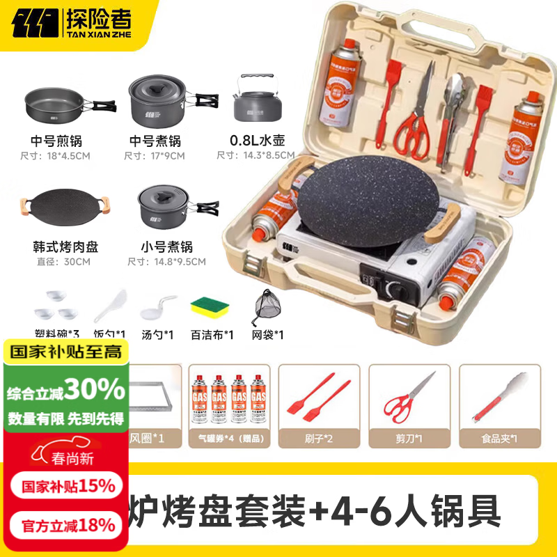 探险者卡式炉户外卡式炉具套装防爆卡磁炉全套带锅烤盘露营野餐烧烤卡斯 卡式炉烤盘套装+4-6人锅具