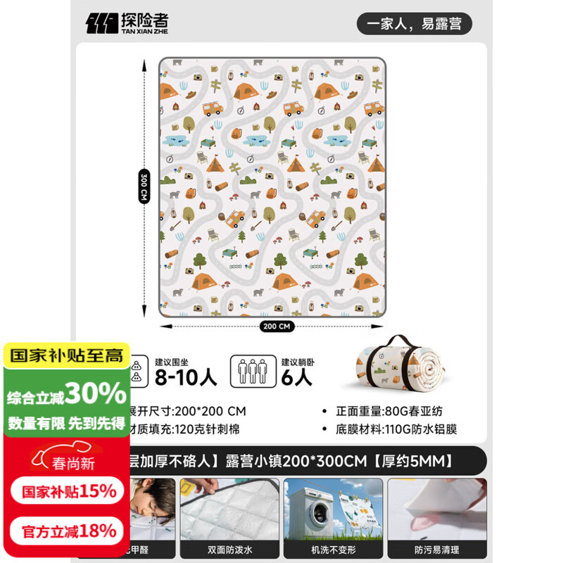 探险者(TAN XIAN ZHE)野餐垫户外加厚超大便携露营垫春游野炊草坪地垫防水防潮垫爬行垫 【7层加厚不硌人】露营小镇200*300cm【厚约5mm】