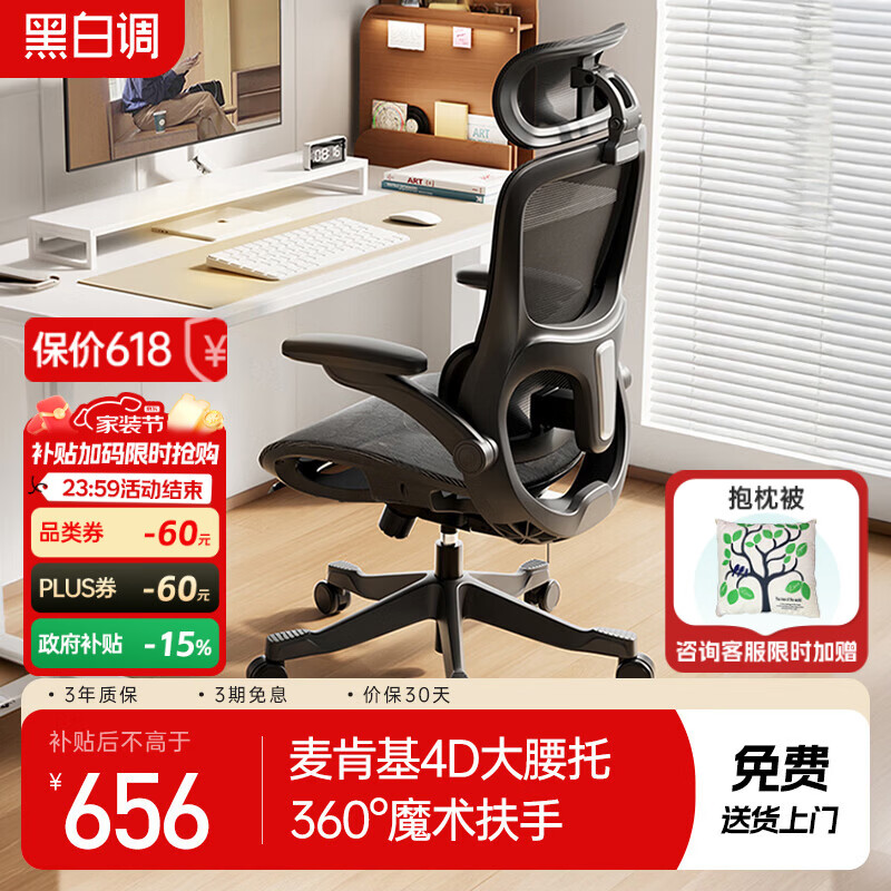 黑白调P2 Pro+二代人体工学电脑椅办公椅学习椅久坐舒适电竞椅4D腰托 P2Pro+二代耀黑 4D腰托+360°扶手