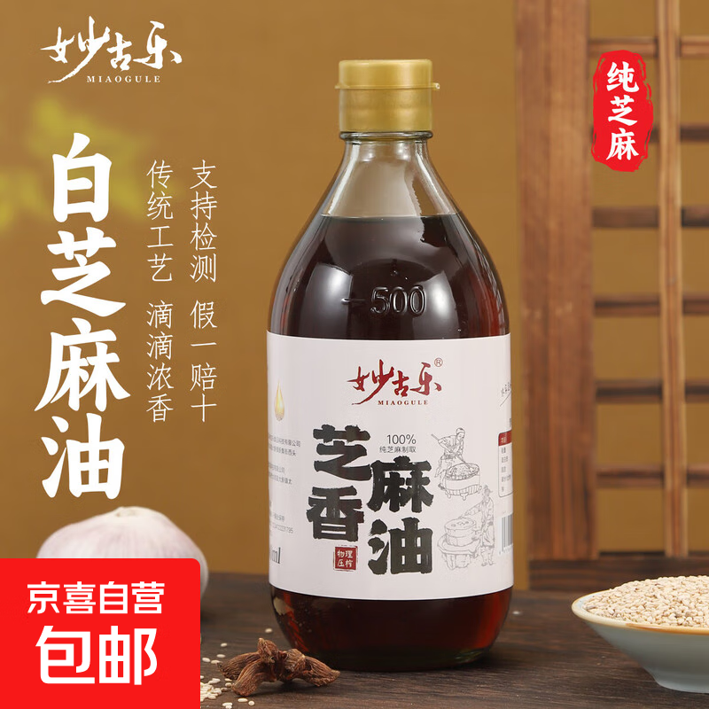 正宗妙古乐100%纯芝麻香油火锅蘸料拌菜拌面家用调味玻璃瓶 妙古乐100%纯芝麻香油500ml*1瓶