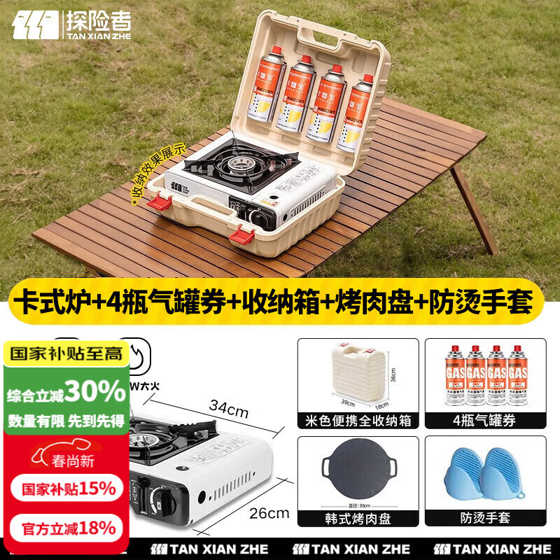 探险者(TAN XIAN ZHE)卡式炉户外野外炉具炊具卡斯炉一体便携式卡磁煤气瓦斯露营燃气灶 卡式炉+收纳箱+烤盘+4气券(赠品)