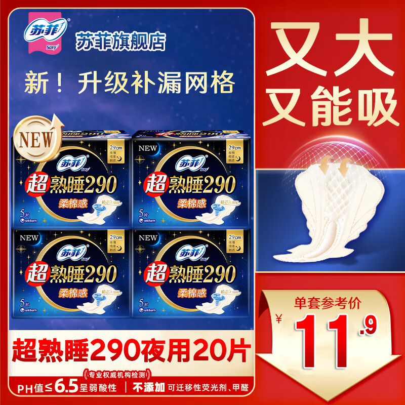 苏菲卫生巾夜用290mm姨妈巾量大加长量多整箱套装批发 超熟睡夜用290mm20片