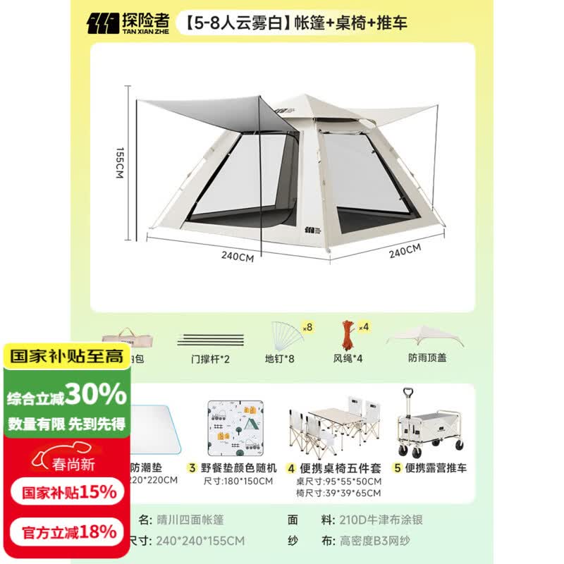 探险者(TAN XIAN ZHE)帐篷户外露营防雨过夜3人-4人速开便捷天幕二合一黑胶防晒帐篷 【5-8人云雾白】帐篷+桌椅+推车