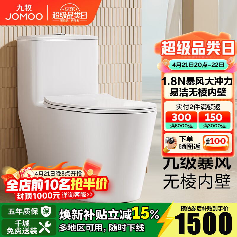 九牧(JOMOO)马桶家用一级水效防臭卫浴虹吸式马桶坐便器大冲力抗菌卫生间坐厕 【IF大奖-1.8N暴风冲】11383 305坑距(2515城包安装)