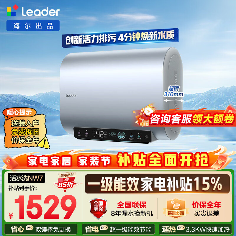 海尔(Haier)出品统帅国家补贴超薄双胆电热水器扁桶储水式变频速热巨能洗 一级能效省电 小红花系列镁棒免更换 60L 3300W 4分钟换新水质/水质提醒NW7