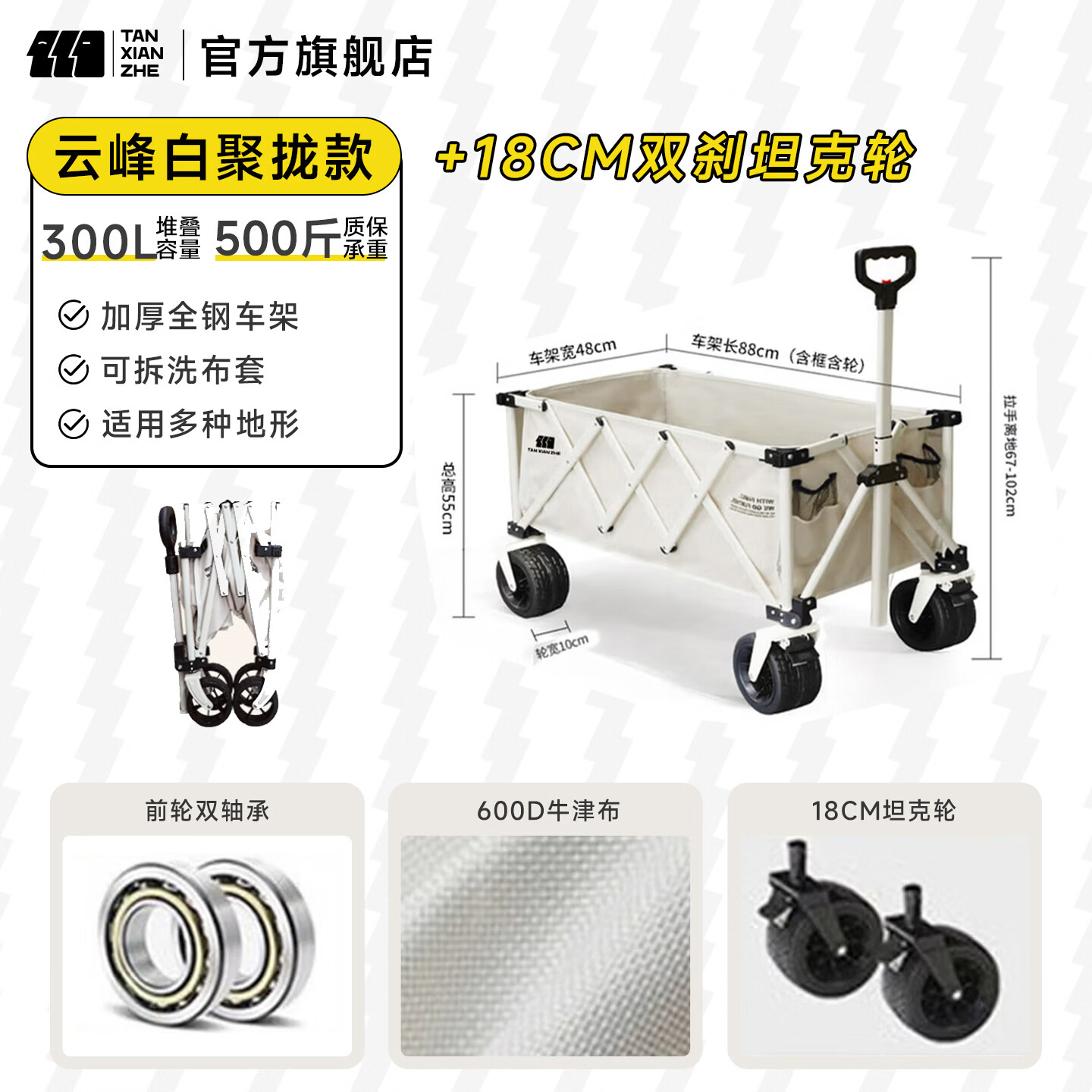 探险者(TAN XIAN ZHE)露营车儿童可躺户外推车野餐车露营装备折叠露营推车营地车买菜车 300L 云峰白聚拢款【双刹坦克轮】
