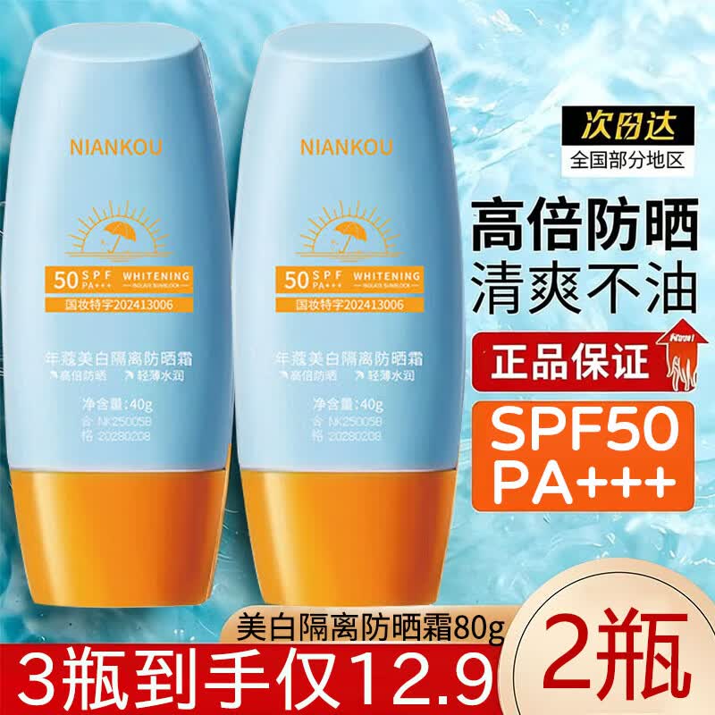 年蔻(NIANKOU)高倍防晒霜美白提亮隔离三合一防水防汗紫外线spf50户外军训男女 2瓶80g【夏日必备】