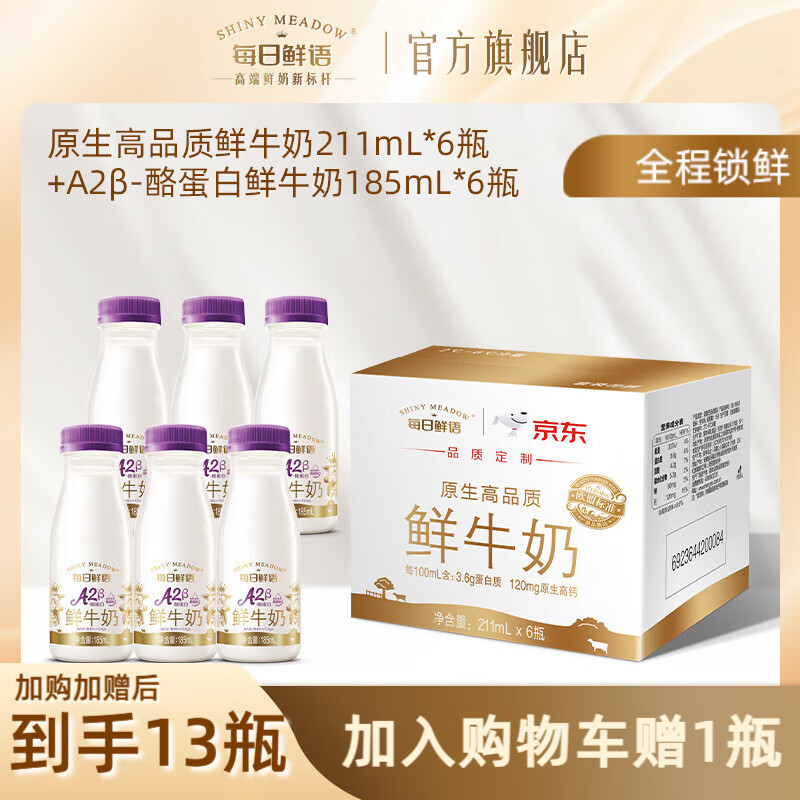 每日鲜语A2β酪蛋白亲和易吸收鲜奶+全脂高钙鲜牛奶小瓶生牛乳早餐搭档 A2β 185ml*6瓶+211ml*6瓶-ZP