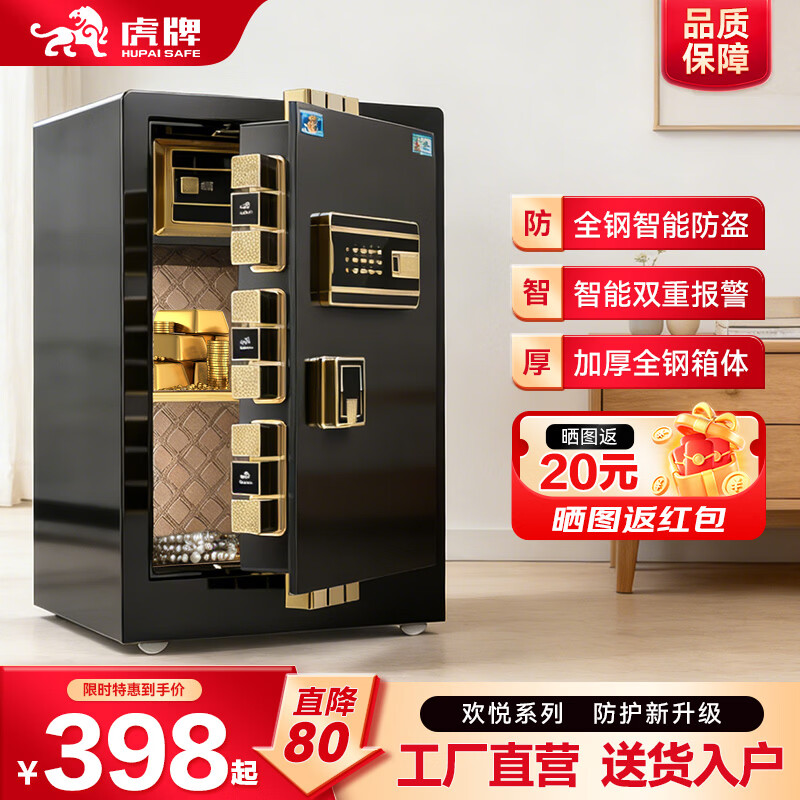 虎牌保险柜家用小型保管箱指纹密码WIFI办公财务专用保险柜全钢防盗可入墙保险箱 【超值推荐】欢悦系列 60cm黑色 密码款(钥匙+密码)