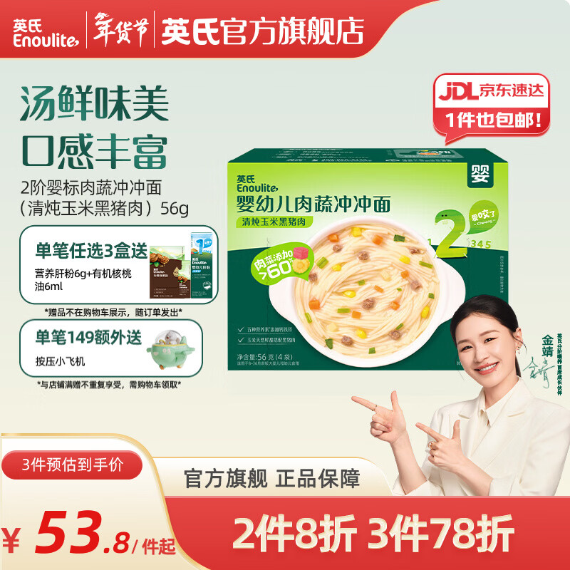 英氏(Engnice)【宝宝面条专区】婴幼儿有机面条辅食儿童意面碎碎面蝴蝶面 2阶肉蔬冲冲面(清炖玉米黑猪肉)56g