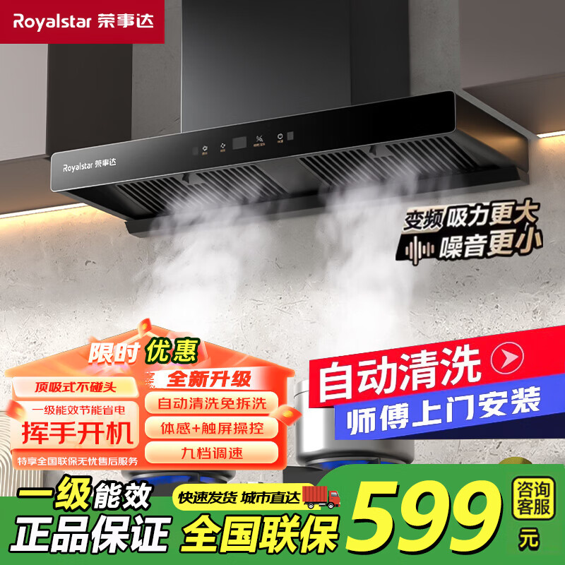 荣事达油烟机家用抽油烟机大吸力顶吸式吸油烟机一级能效欧式出租房烟机燃气灶套装品牌补贴以旧换新 顶配900宽双腔+九档直流变频+自动清洗包安装