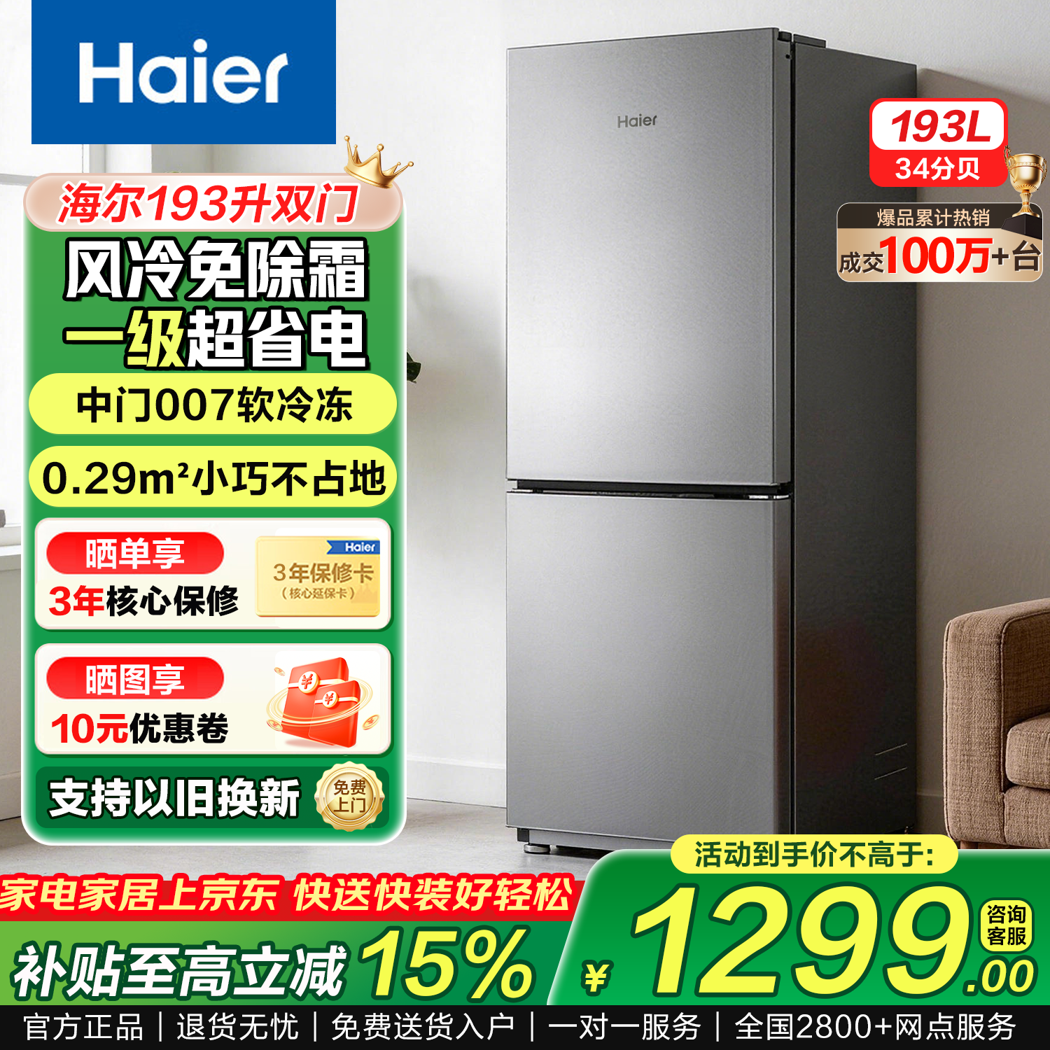 海尔冰箱双开门风冷无霜节能一二门新等级能效冰箱小型1.5米高小户型家用冰箱变频超薄冰箱出租房两门 193升双门冰箱一级能效风冷无霜除菌
