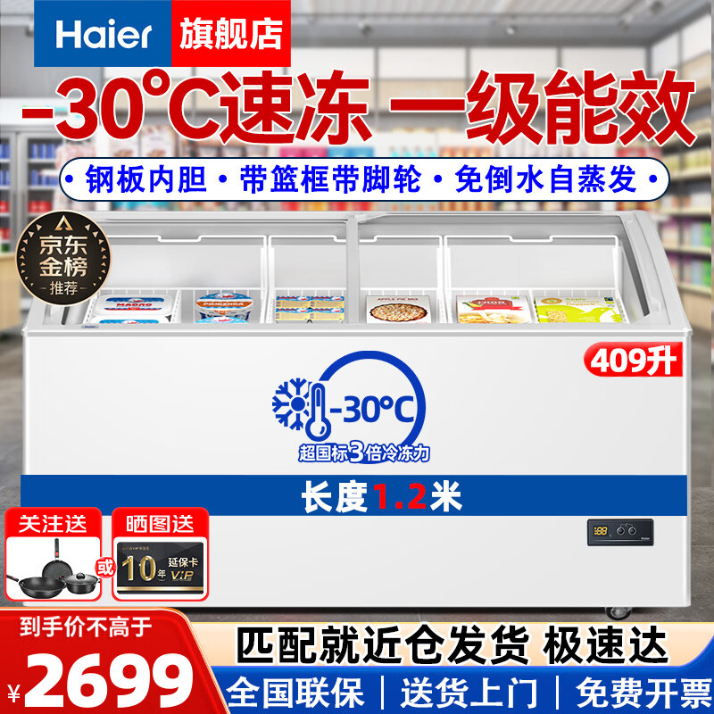 海尔(Haier)商用卧式大容量展示柜冰柜冷冻商超组合岛柜玻璃门雪糕柜弧形门海鲜冻品 1.2米零下30度冷冻409升一级能效带锁电子温控